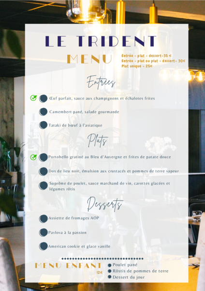 Le restaurant Le Trident est un endroit idéal pour les dîners romantiques en amoureux, les repas en famille ou les déjeuners d'affaires. Il dispose d'une terrasse extérieure qui permet de profiter du soleil et de la brise marine pendant les mois d'été. Il est conseillé de réserver à l'avance, surtout pendant les périodes de pointe.
